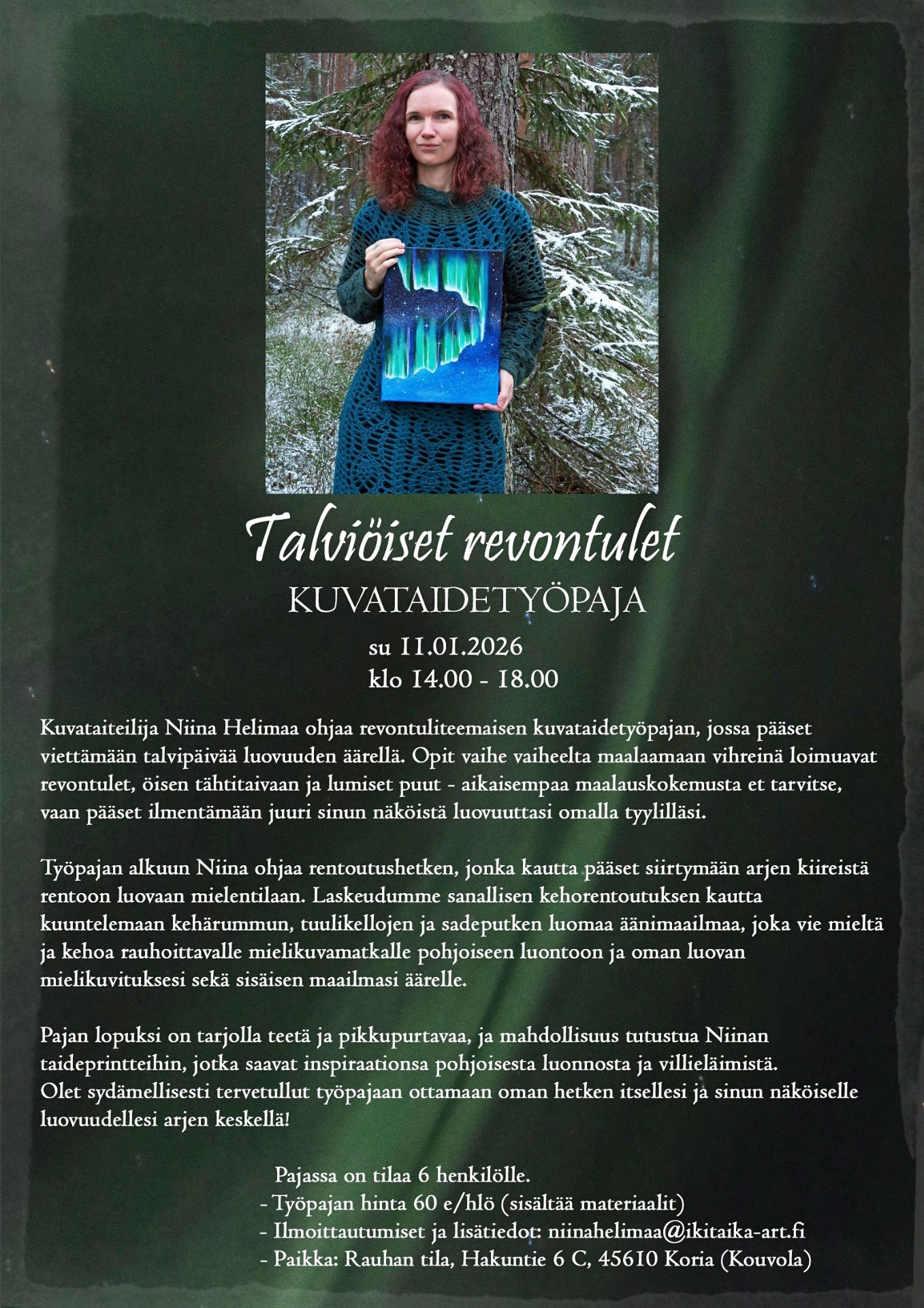 - Työpajan hinta 60 e (sisältää materiaalit: 35 x 27 cm maalauspohjan, akryylimaalit, siveltimet ja palettiveitsen, paletin ja pöytätilan)
