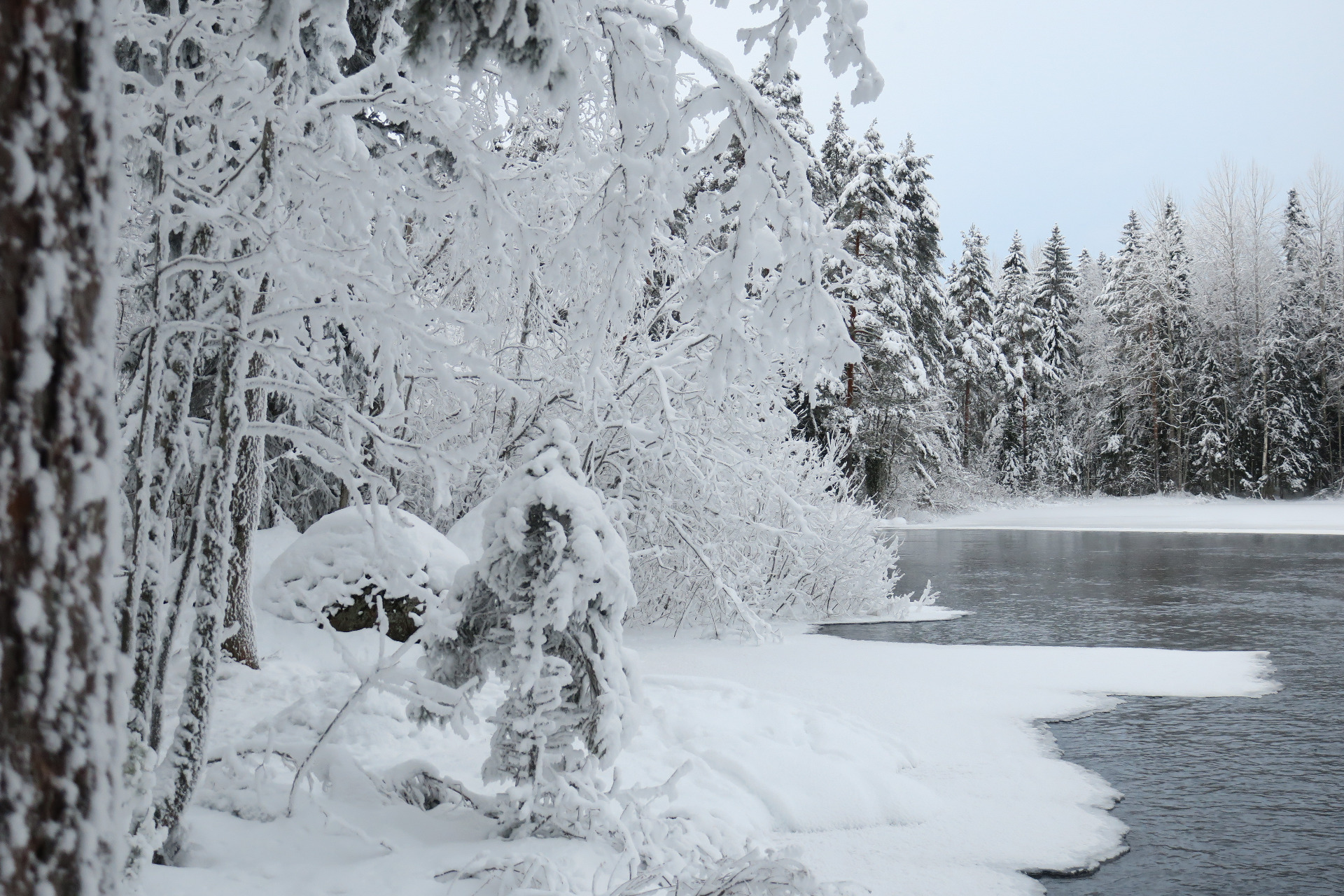 Kylmänkauniit jääkukat koristelevat jäälauttoja jokivirran rannalla, puuterimainen tuore pakkaslumi koristelee huurteella havupuiden oksat ja kaarnakyljet sekä sammaleet ja varvut, veteen kurottanut kuusenoksa on jäätynyt latvastaan virtaan kiinni ja sen mukana keinuu iso "jäähelmi-pisara", ja virrasta törröttävä pieni jäätynyt oksa puolestaan...